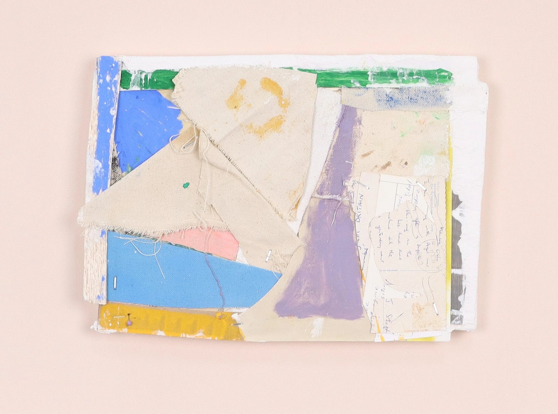 Cut and folded canvas, paper, cardboard , paints, pastels and staples on wooden support. Framed in open tray frame.