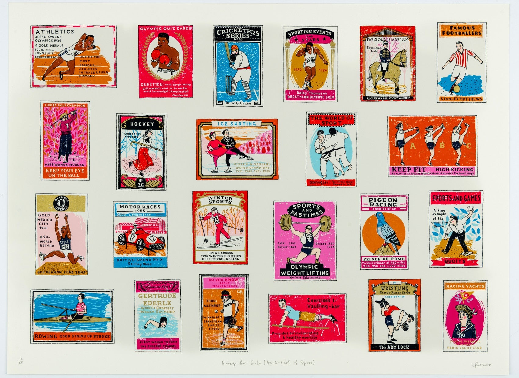 A handmade screen print of an A to Z ish of sport. Each sport is shown on a detailed illustrated card based on vintage cigarette cards. The edition is 65 as that's how many medals Team GB won in the 2024 Paris Olympics. A 17 colour screen print on 300gsm Fabriano Artistico paper.